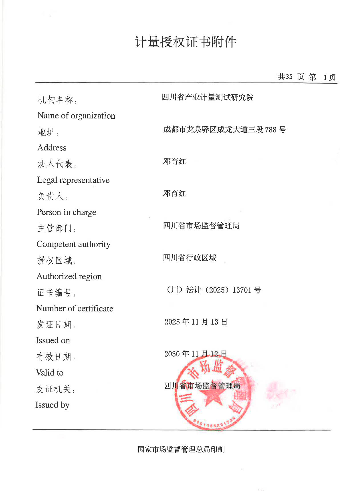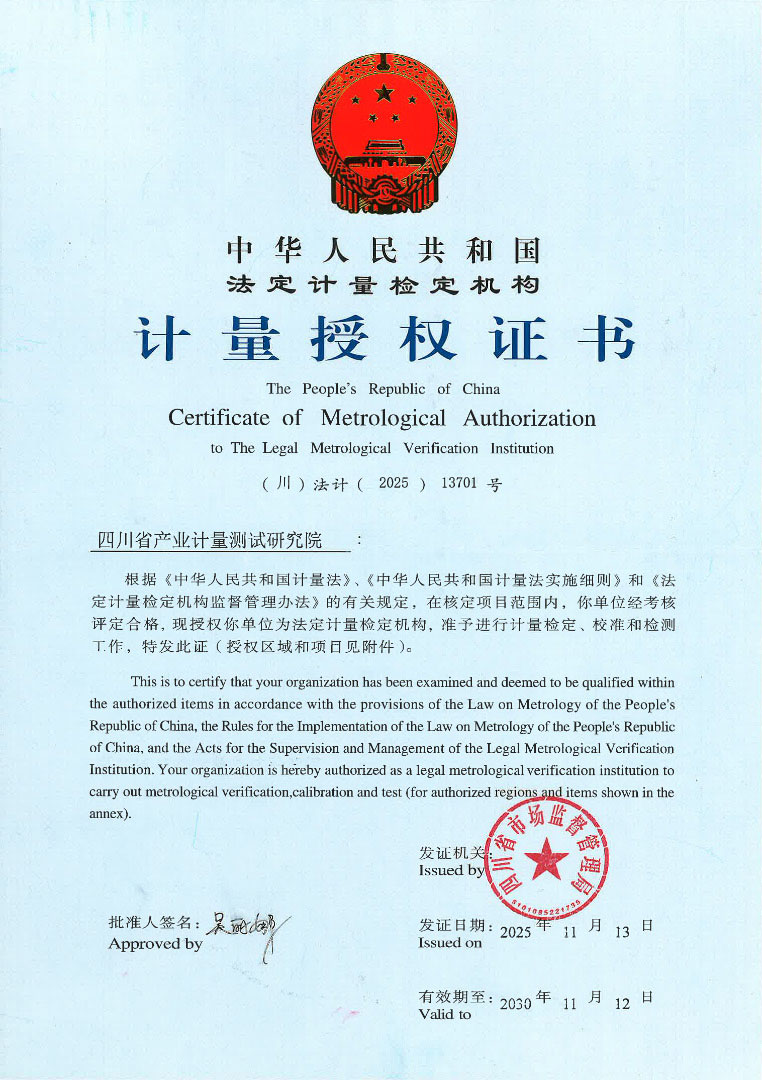 四川省产业计量测试研究院(简称“省计量院”)为省市场监督管理局管理的公益一类事业单位,是省级法定计量技术与科研机构。其前身是四川重大技术装备几何量计量站,后由国家质检总局批复成立国家重大技术装备几何量计量站,是国家总局授权建立的国内唯一从事重大技术装备几何量计量检测的国家级专业计量站。2021年11月,更为现名。主要承担法制计量任务,研究、建立全省社会公用计量标准;承担授权范围内的产业计量检测技术服务,为行业、产业提供全产业链技术服务;开展产业计量检测技术研究。